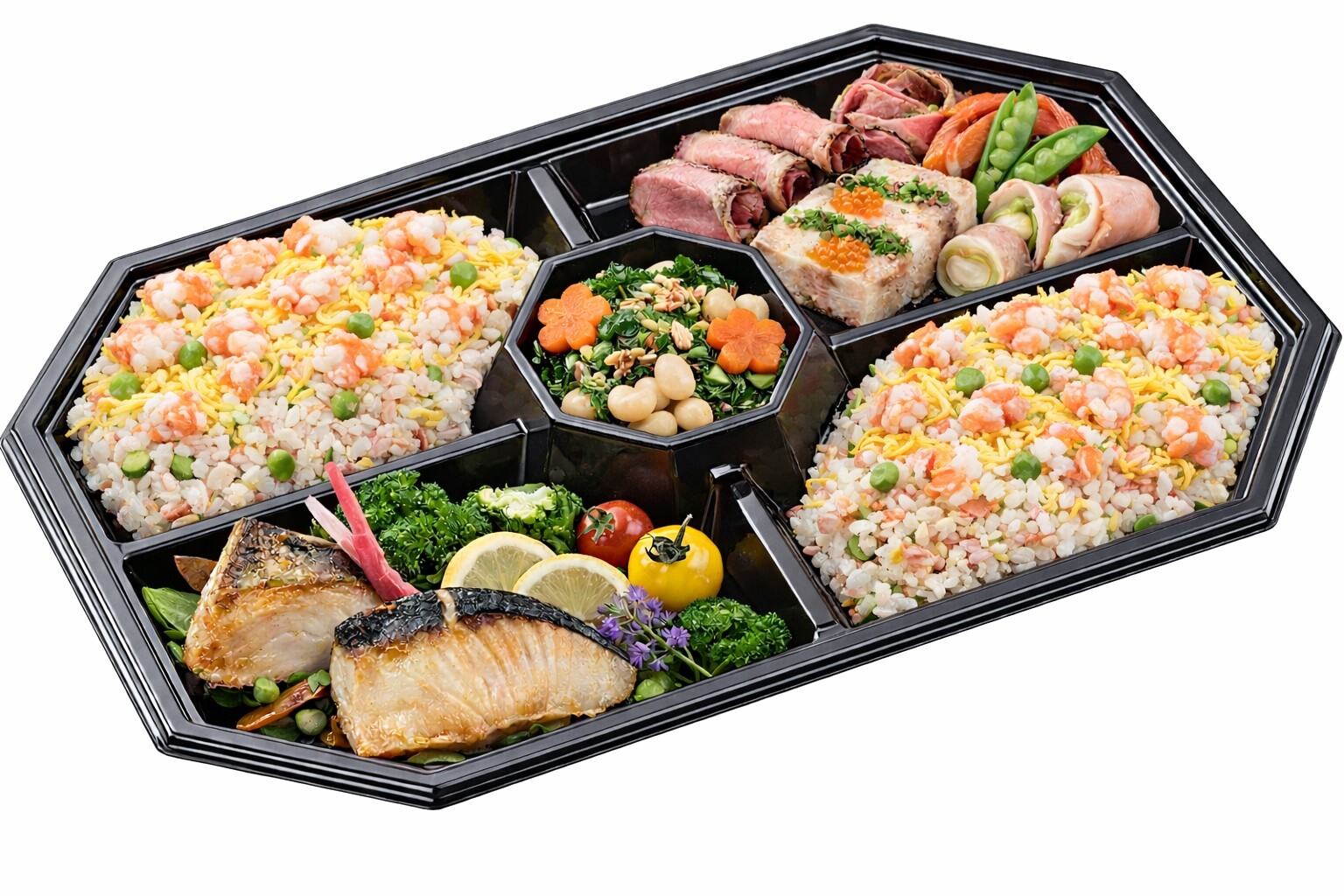 肉・魚・焼き物・煮物・野菜etc バランス,色どり良くお詰めします。